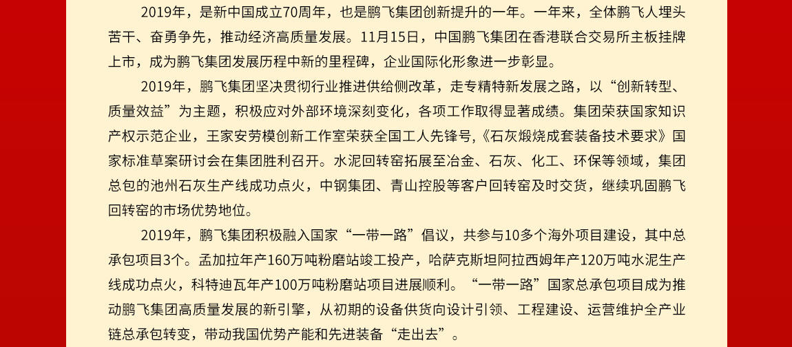 行者常至,為者常成。2020年是全面決勝小康社會和“十三五”規(guī)劃收官之年,是鵬飛集團(tuán)再創(chuàng)佳績的關(guān)鍵之年。新的一年,我們將以習(xí)近平新時代中國特色社會主義思想為指引,全面貫徹黨的十九大和十九屆二中、三中、四中全會精神,團(tuán)結(jié)一心、擔(dān)當(dāng)作為,踐行新發(fā)展理念,堅持高質(zhì)量發(fā)展,大力實施“科技化、國際化、資本化、品牌化”戰(zhàn)略,為建成回轉(zhuǎn)窯、粉磨設(shè)備制造與服務(wù)全球知名的企業(yè)集團(tuán),為裝備制造高質(zhì)高效、節(jié)能環(huán)保及國際產(chǎn)能合作而努力奮斗!