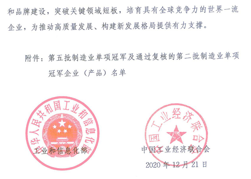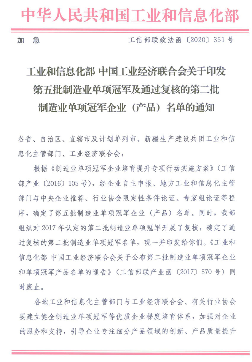 再次奪得“制造業(yè)單項(xiàng)冠軍示范企業(yè)”稱號(hào)