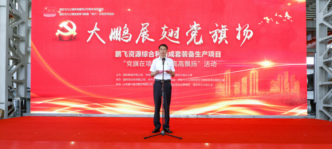 “今天活動現(xiàn)場的‘鵬飛資源綜合利用成套裝備生產項目’是2021年江蘇省重大項目,南通市‘黨旗在項目一線高高飄揚’活動第一批啟動項目。為了著力提升服務效能,健全重大項目服務機制,大公鎮(zhèn)牽頭組織成立項目臨時黨支部、項目服務專班,一刻不停推項目,讓黨旗飄揚在項目一線;一著不讓抓發(fā)展,讓黨員沖鋒在項目一線;一以貫之優(yōu)環(huán)境,讓服務下沉到項目一線,著力辦實事、解難題,為推進重大項目建設提供有力支撐和堅實保障。”大公鎮(zhèn)黨委書記金山存說。
