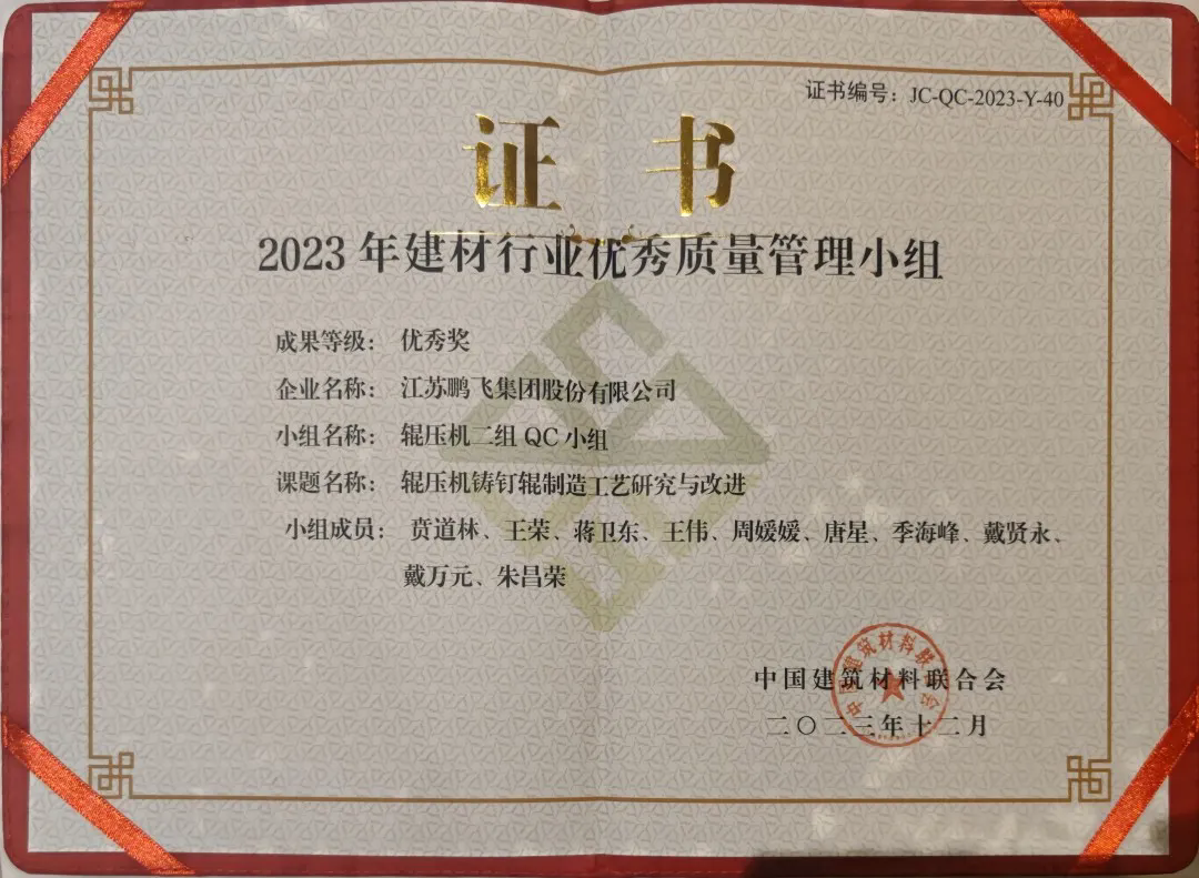 近期,中國(guó)建筑材料聯(lián)合會(huì)組織召開(kāi)第三十九次建材行業(yè)質(zhì)量管理小組代表大會(huì)暨質(zhì)量信得過(guò)班組經(jīng)驗(yàn)交流大會(huì),會(huì)上頒發(fā)了2023年建材行業(yè)優(yōu)秀質(zhì)量管理小組和質(zhì)量信得過(guò)班組、先進(jìn)個(gè)人和優(yōu)秀組織榮譽(yù)證書(shū)。鵬飛金工大齒輪“三合三分”加工工法獲得“2023年建材行業(yè)優(yōu)秀質(zhì)量管理小組三等獎(jiǎng)”;輥壓機(jī)二組QC小組的輥壓機(jī)鑄釘輥制造工藝研究與改進(jìn)獲得“2023年建材行業(yè)優(yōu)秀質(zhì)量管理小組優(yōu)秀獎(jiǎng)”,同時(shí)QC小組獲評(píng)“我最喜愛(ài)的質(zhì)量管理小組”。