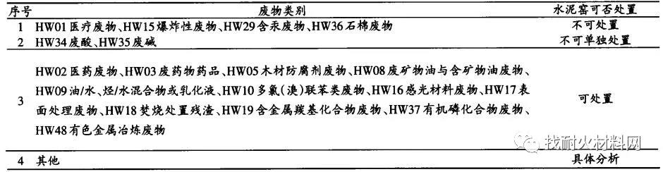 危險廢棄物種類繁多,成分復(fù)雜,存在多種形態(tài),在利用水泥窯進行處置時必須遵守兩個基本準(zhǔn)則,其一:處置要絕對安全可靠,不能帶來新的環(huán)境污染或污染轉(zhuǎn)移;其二:不能影響水泥熟料正常的生產(chǎn)質(zhì)量。大量實驗研究及工業(yè)化試生產(chǎn)實踐證實,水泥窯可以處置的類別有:廢酸、廢堿、有機溶劑廢物、乳化液、固體危險廢物、醫(yī)藥廢物、廢藥物藥品、精餾殘渣、廢礦物油等,約占《國家危險廢物名錄》總數(shù)的50%左右。各類危廢是否可采用水泥窯處置的具體分類見表2。