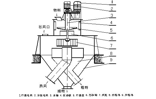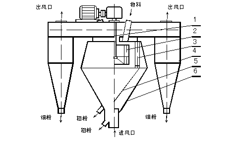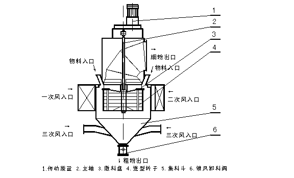 由傳動裝置、回轉(zhuǎn)部分(主軸、撒料盤、轉(zhuǎn)子等),機殼(內(nèi)筒、導向葉片、內(nèi)錐體、外筒、外錐體、進風口、加料口、兩個粗粉出口等),細粉收集裝置(四個旋風筒等)組成。