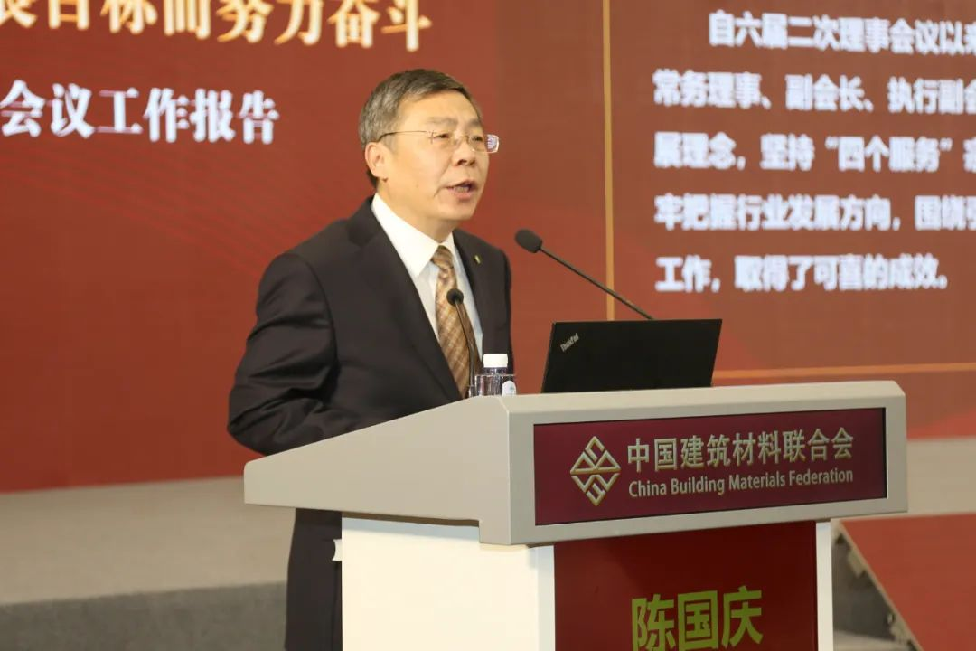 受會(huì)長(zhǎng)閻曉峰委托,陳國(guó)慶代表中國(guó)建筑材料聯(lián)合會(huì)六屆理事會(huì)作題為《堅(jiān)持綠色低碳安全高質(zhì)量發(fā)展 堅(jiān)持“四個(gè)服務(wù)”工作定位 為實(shí)現(xiàn)“宜業(yè)尚品、造福人類”行業(yè)發(fā)展目標(biāo)而努力奮斗》的工作報(bào)告。報(bào)告回顧了聯(lián)合會(huì)近一年來(lái)的工作情況,分析了面臨的形勢(shì)任務(wù),提出了下一步工作思路舉措。