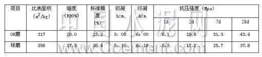 表中數(shù)據(jù)說明:在凝結(jié)時間、標(biāo)準(zhǔn)稠度需水量基本相同的前提下,OK磨磨制的水泥28d抗壓強(qiáng)度比球磨水泥高出15%,同時,水泥的早期強(qiáng)度也高,可進(jìn)一步增加混合材摻量,降低水泥生產(chǎn)成本。