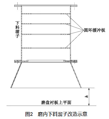一方面它降低了入磨物料高落差對溜子的沖刷,另一方面圓環(huán)的收口作用使得物料的下料點發(fā)生了變化,將原先的單點偏心下料改成接近中心下料,改善了物料在磨盤上的偏離現(xiàn)象。同時,適當調(diào)整h值的大?。ㄔO(shè)計600mm,最終改為400mm),使得下料波動時,可以起到一定的緩沖作用,穩(wěn)定料床。