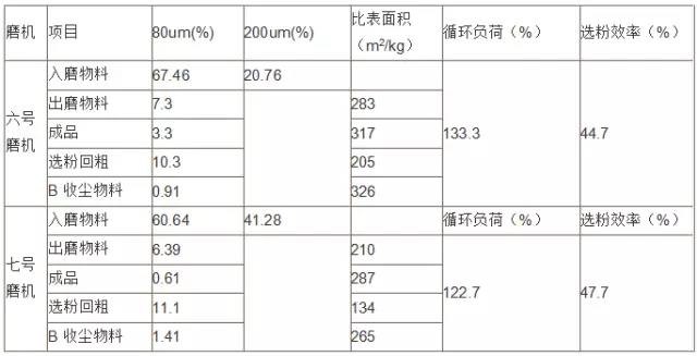 2、同時(shí)對(duì)六七號(hào)磨機(jī)的入磨物料、出磨物料、選粉機(jī)回粗、B收塵的物料、水泥成品、在磨機(jī)運(yùn)轉(zhuǎn)正常的情況下進(jìn)行取樣,做80um、200um、及比表面積以計(jì)算磨機(jī)的循環(huán)負(fù)荷和選粉機(jī)的選粉效率。測(cè)量結(jié)果見(jiàn)下表: