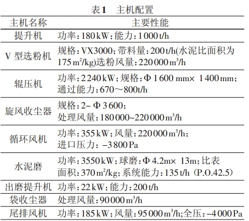 此系統(tǒng)主要由 V 型選粉機(jī)、輥壓機(jī)、旋風(fēng)收塵器和球磨機(jī)組成。球磨機(jī)系統(tǒng)為開(kāi)流系統(tǒng),輥壓機(jī)系統(tǒng)放風(fēng)與球磨機(jī)通風(fēng)共用一套收塵系統(tǒng)。流程見(jiàn)圖1,主機(jī)配置見(jiàn)表 1。