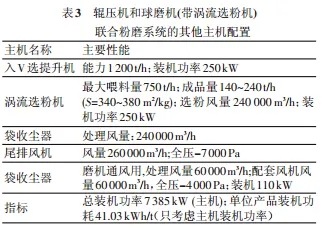 此系統(tǒng)主要由V 型選粉機(jī)、輥壓機(jī)、球磨機(jī)和渦流選粉機(jī)組成,球磨機(jī)系統(tǒng)為閉路系統(tǒng),流程見(jiàn)圖4。該系統(tǒng)的V 型選粉機(jī)、輥壓機(jī)、水泥磨和出磨提升機(jī)的配置及其性能完全同表 2,其他主機(jī)配置見(jiàn)表3。