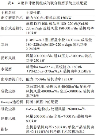 此系統(tǒng)主要由立磨、組合式選粉機(jī)、球磨機(jī)和O-Sepa 選粉機(jī)組成,球磨機(jī)系統(tǒng)為閉路系統(tǒng),流程圖見(jiàn)圖 5,主要的主機(jī)配置見(jiàn)表 4。