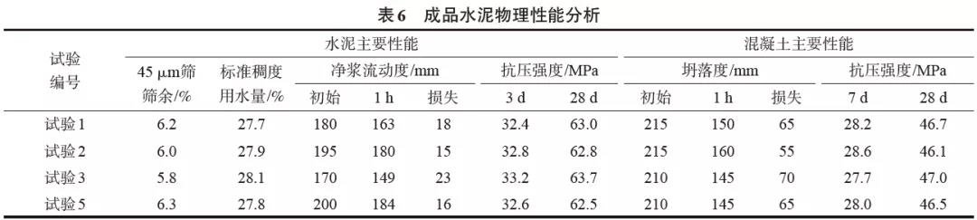 成品水泥顆粒組成變化分析見表5,成品水泥物理性能變化見表6。其中,(1)水泥凈漿流動度和混凝土坍落度試驗中減水劑均使用JY公司生產(chǎn)的PS-1型聚羧酸減水劑;(2)水泥凈漿流動度試驗依照GB/T 8077—2012《混凝土外加劑勻質(zhì)性試驗方法》進行,減水劑摻入量為水泥質(zhì)量的0.8%;(3)混凝土強度等級為C30,依照JGJ 55—2011《普通混凝土配合比設(shè)計規(guī)程》進行的相同配合比設(shè)計,減水劑摻入量為膠凝材料質(zhì)量(水泥、粉煤灰和礦粉)的2.0%,膠凝材料和骨料均為同一進廠批次,坍落度試驗依照GB/T 50080—2016《普通混凝土拌合物性能試驗方法標(biāo)準(zhǔn)》進行。