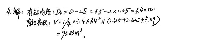 4、已知某φ3.5m磨機(jī)襯板的厚度為0.05m,一倉長(zhǎng)2.625m,二倉2.3625m,三倉5.09m,求該磨機(jī)的有效內(nèi)徑和有效容積。